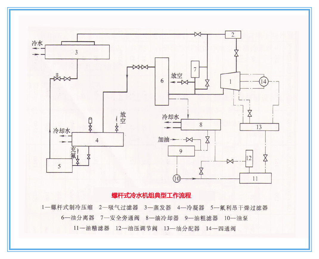 螺桿式冷水機(jī)組的典型工作流程如下圖所示,它由制冷系統(tǒng)和潤(rùn)滑油系統(tǒng)兩部分組成。制冷系統(tǒng)的工作流程為:制冷劑在蒸發(fā)器中汽化,所產(chǎn)生的蒸氣經(jīng)過(guò)吸氣過(guò)濾器進(jìn)入壓縮機(jī)。制冷劑在壓縮機(jī)中被壓縮成高壓氣體,同時(shí)潤(rùn)滑油噴入壓縮機(jī)中與制冷劑一起被壓縮,壓縮后潤(rùn)滑油和制冷劑進(jìn)入油分離器,其中無(wú)油的制冷劑進(jìn)入冷凝器,在冷凝器中變?yōu)轱柡鸵后w后進(jìn)入過(guò)冷器過(guò)冷,變?yōu)檫^(guò)冷液體,然后流向節(jié)流閥,經(jīng)過(guò)節(jié)流降壓降溫后進(jìn)入蒸發(fā)器。潤(rùn)滑油系統(tǒng)由油分離器、油冷卻器、油過(guò)濾器、油泵、油壓調(diào)節(jié)閥、油分配器和四通閥組成,其工作流程為:從油分離器分離出來(lái)的潤(rùn)滑油,為避免油溫過(guò)高降低潤(rùn)滑性,先經(jīng)過(guò)油冷卻器進(jìn)行冷卻,然后在沒(méi)泵作用下經(jīng)過(guò)油粗濾器、油精濾器進(jìn)入油分配器,接著分成兩路進(jìn)入壓縮同。一路去潤(rùn)滑軸承并起冷卻作用,另一路去壓縮機(jī)噴射。