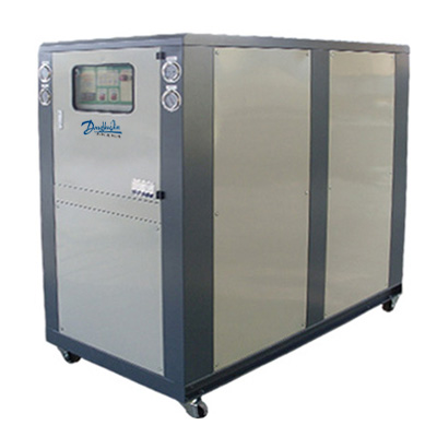 其次,要了解水冷箱式冷水機(jī)是由哪些組成的。一般來(lái)說(shuō),冷水機(jī)主要有四大件,即壓縮機(jī)、蒸發(fā)器、冷凝器、節(jié)流元件。而實(shí)際上是遠(yuǎn)遠(yuǎn)不止這些的,比如DYJ-W系列水冷箱式冷水機(jī)的組成就有以下這么多:渦旋式壓縮機(jī),殼管式蒸發(fā)器,水箱盤(pán)管式蒸發(fā)器(水箱需要做保溫處理),循環(huán)水泵,膨脹閥,過(guò)濾器,電磁閥,壓力表,電控系統(tǒng),數(shù)字顯示控制面板,腳輪等等(根據(jù)型號(hào)大小組件會(huì)稍有不同),并充好制冷劑做好性能測(cè)試,用戶將水冷箱式冷水機(jī)買(mǎi)回去以后,只要將冷卻水塔,循環(huán)水泵,冷水機(jī)以及被制冷設(shè)備之間用水管連接即可使用。